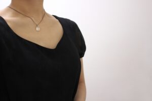 黒い服なので暗くならないアクセサリーを着けるといいよ。